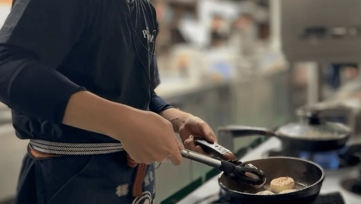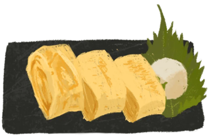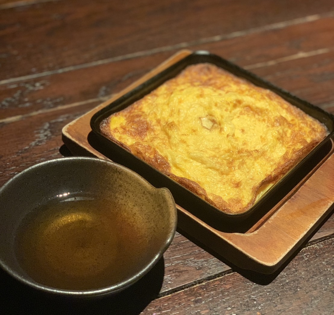【愛情たっぷり玉子焼き】550円 鉄板の上で完成。あの頃の味、復活。 真ん中をそっと割ると、出汁を流し込んで完成。名物玉子焼き。