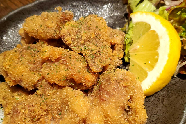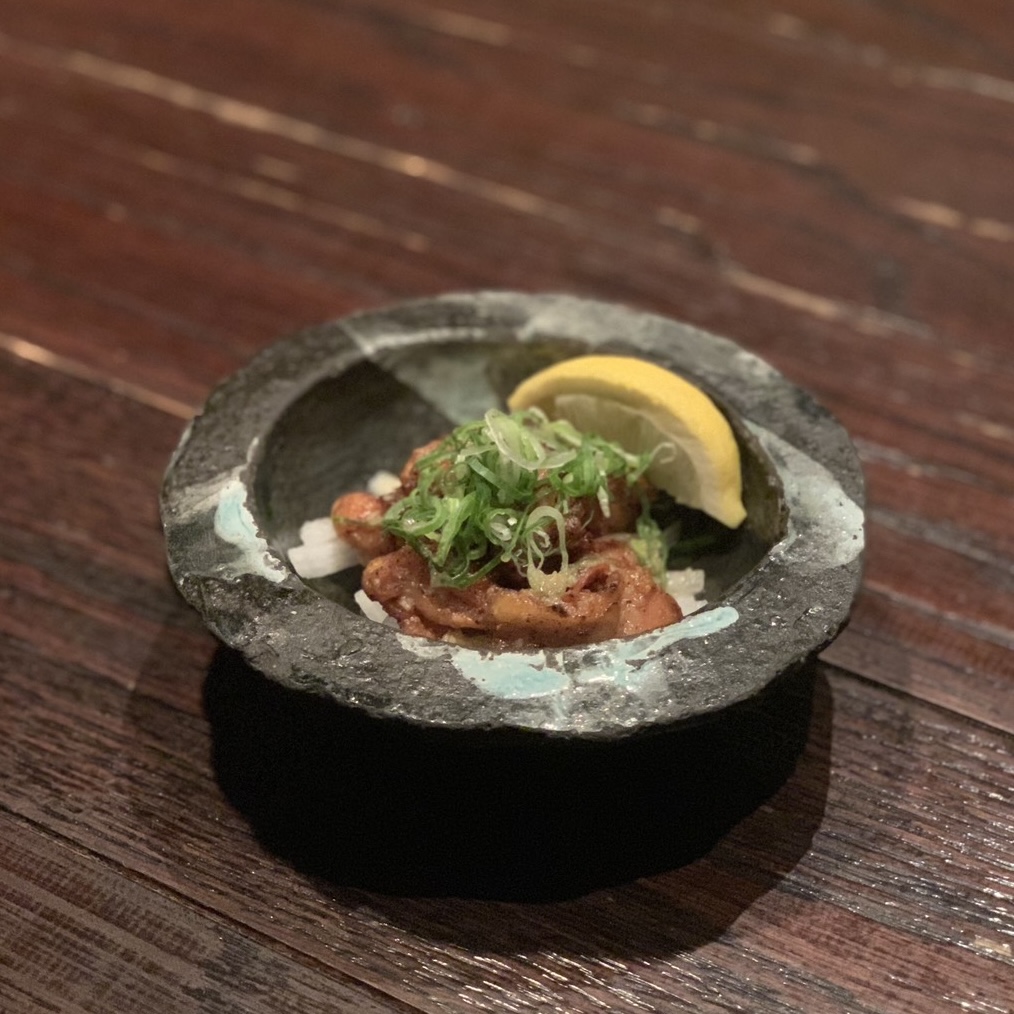 【鶏ハラミの唐揚げ】550円 噛むほど旨い鶏ハラミを唐揚げに。ポン酢とレモンが旨みを引き立てます。