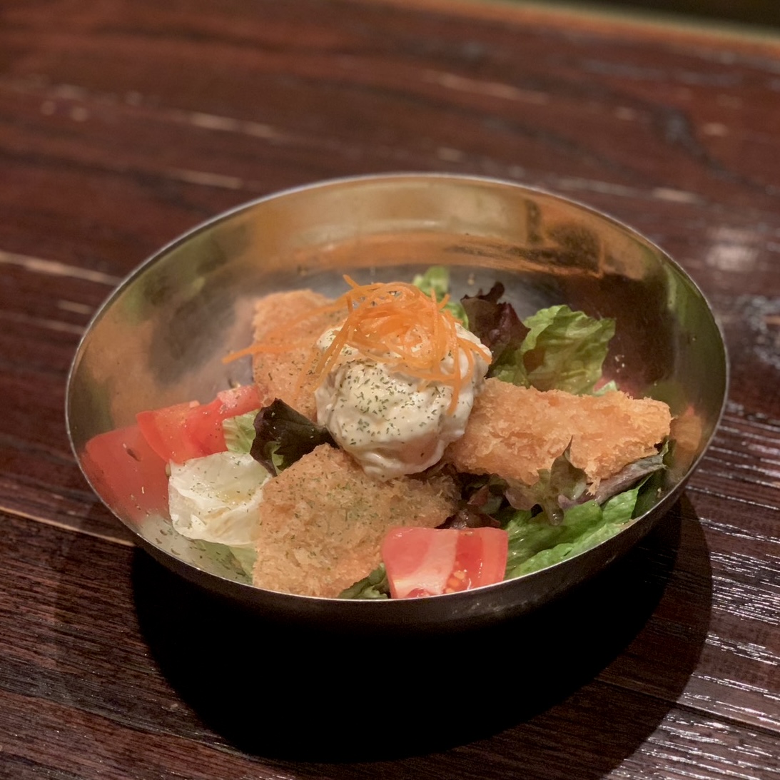 【アジフラサラダ】880円 コクのタルタル、さっぱりポン酢。 重くないので、最初の一品に。 アジフライサラダ